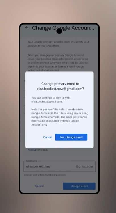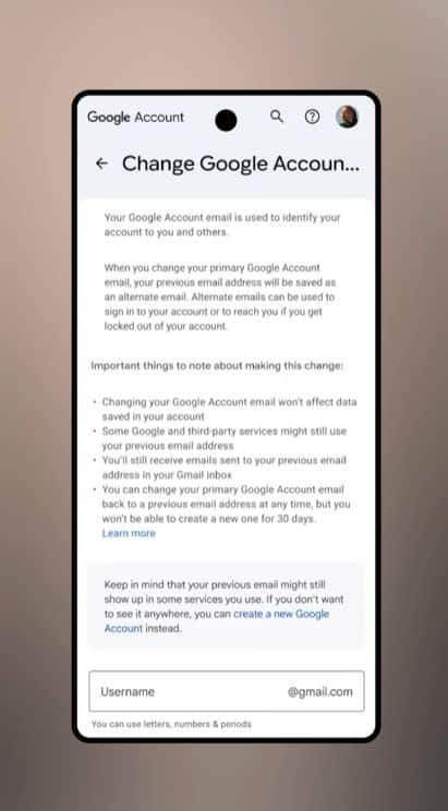 ทางบริษัทได้เผยแพร่คลิปวิดีโอสั้นๆ ที่อธิบายขั้นตอนต่างๆ อย่างละเอียด ซึ่งก็ทำได้ง่ายมากๆ ครับ ให้ไปที่การตั้งค่าบัญชี Google แตะ ข้อมูลส่วนบุคคล จากนั้น “อีเมล” แล้วแตะ “อีเมลของบัญชี Google” จากนั้นก็จะเห็นปุ่มสีน้ำเงินขนาดใหญ่ที่เขียนว่า “เปลี่ยนอีเมลบัญชี Google” แตะที่ปุ่มนั้น แล้วเลือกอีเมลใหม่ได้เลย