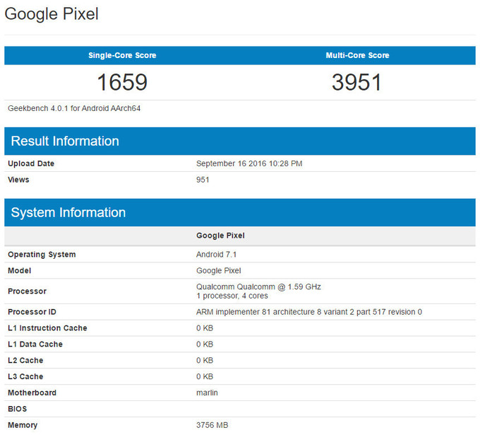 Google Pixel XL Benchmark Shows 4GB RAM, Android 7.1 And More