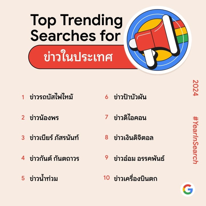 ศารณีย์ บุญฤทธิ์ธงไชย Country Marketing Manager, Google ประเทศไทย เปิดเผยว่า “Google Search ได้กลายเป็นช่องทางหลักที่คนไทยใช้ค้นหาข้อมูลหลากหลายรูปแบบ ไม่ว่าจะเป็นข่าวสารเหตุการณ์สำคัญ กระแสสังคม หรือความสนใจส่วนตัว โดยเทรนด์การค้นหาในแต่ละปีสะท้อนให้เห็นถึงการปรับตัวของผู้คนตามสถานการณ์ที่เปลี่ยนแปลงไปทั้งในประเทศและทั่วโลก รวมทั้งยังสะท้อนให้เห็นถึงพฤติกรรมและความสนใจในเรื่องคุณภาพชีวิต เช่น สวัสดิการรัฐ ข่าวการเลือกตั้งในต่างประเทศ ซึ่งบ่งชี้ถึงการมีส่วนร่วมในสังคมและการเข้าถึงข้อมูลข่าวสารของคนไทยอย่างแพร่หลาย นอกจากนี้ พฤติกรรมการค้นหาความบันเทิงและสถานที่ท่องเที่ยวยังสะท้อนให้เห็นถึงไลฟ์สไตล์และความต้องการพักผ่อนหย่อนใจของผู้คนในปัจจุบันอีกด้วย”