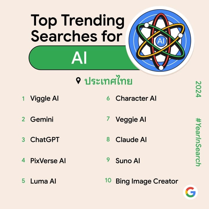 ในปีที่ผ่านมา การใช้เครื่องมือปัญญาประดิษฐ์ หรือ AI (Artificial Intelligence) ได้รับความนิยมในหมู่คนไทยทั้งในชีวิตประจำวันและการทำงานอย่างแพร่หลาย ตั้งแต่หมวดเครื่องมือสร้างวิดีโอด้วย AI เช่น “Viggle AI” ที่ครองอันดับ 1 รวมทั้ง “PixVerse AI” และ “Luma AI” และหมวดผู้ช่วย AI ที่ช่วยเพิ่มประสิทธิภาพในการทำงาน และกระตุ้นการสร้างสรรค์ไอเดียใหม่ๆ โดย “Gemini” ติดอันดับ 2 ตามด้วย “ChatGPT” จนถึงหมวดแพลตฟอร์ม AI สำหรับสร้างรูปภาพอย่าง “Bing Image Creator”