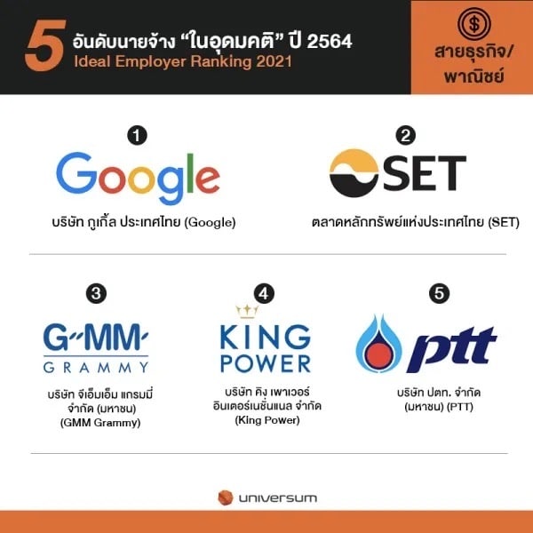 บริษัท จีเอ็มเอ็ม แกรมมี่ จำกัด (มหาชน) ยักษ์ใหญ่แห่งวงการบันเทิงเมืองไทย ครองตำแหน่งอันดับ 3 นายจ้างในอุดมคติ สายธุรกิจ/พาณิชย์ และยังติดอันดับ 4 ของนายจ้างที่ใช้โซเชียลมีเดียสร้างการมีส่วนร่วมมากที่สุด จากข้อมูลเชิงลึกผลสำรวจ ประจำปี 2564 ของ ยูนิเวอร์ซัม (Universum) ผู้นำด้านการสร้างแบรนด์ประเภทองค์กรในระดับสากล ที่เปิดเผยข้อมูลเชิงลึกผลการสำรวจบุคคลผู้มีทักษะสูงทั่วโลกฉบับประเทศไทย และตรวจสอบความต้องการด้านการทำงานของหนุ่มสาวรุ่นใหม่ที่จะเป็นแรงงานในอนาคต