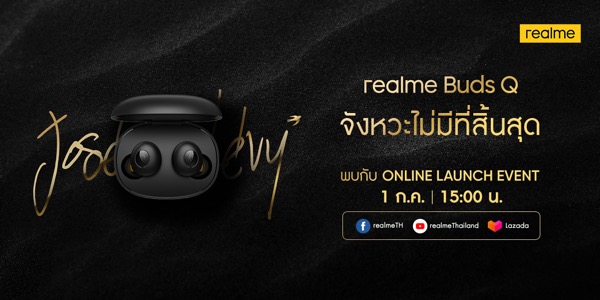 พลาดไม่ได้กับงานเปิดตัว realme Buds Q พร้อมกับสมาร์ทโฟนไฮไลท์พิเศษ ในวันที่ 1 กรกฎาคม เวลา 15.00 น. ผ่านช่องทางเพจ realme THhttps://www.facebook.com/realmeTH, YouTube: realmeThailand และ Lazada https://bit.ly/2B1CPll