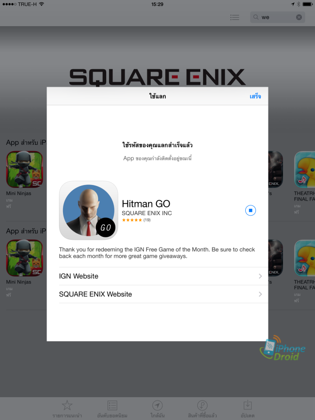 โค๊ดดาวน์โหลดเกมส์ Hitman GO ใช้ได้ทั้ง Apple ID TH, US และอื่น ๆ รวมแล้ว 44 ประเทศด้วยกันครับ วิธีการโหลดให้เข้าไปที่ลิงค์ >> Hitman GO << ด้วย Safari จาก iPhone, iPod, iPad จากนั้นให้แตะไปที่ GET MY FREE GAME เพื่อนำโค๊ตแบบด้านล่างนี้มา Redeem ที่ App Store > Featured (รายการแนะนำ) > เลื่อนลงมาล่างสุด > Redeem (ใช้แลก)