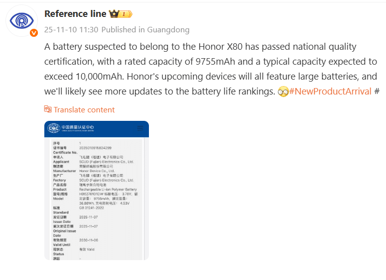 นอกจากนี้ยังมีรายงานว่าแบตเตอรี่ของ HONOR X80 นั้นได้รับการอนุมัติจากแพลตฟอร์มการรับรอง 3C ของประเทศจีนแล้ว มีความจุสูงสุด 9,755mAh และแน่นอนว่าจะโปรโมทด้วยตัวเลขมากถึง 10000mAh นั่นแหละครับ
