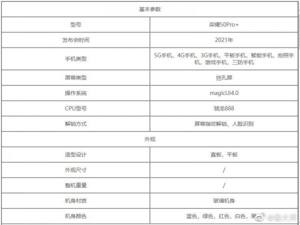 โดย Honor 50 Pro+ นั้นจะมาพร้อมหน้าจอ AMOLED ขนาด 6.79″ ความละเอียด QHD+ refresh rate 120Hz (รองรับ HDR10+) ใช้หน่วยประมวลผล Snapdragon 888 แรมเริ่มต้น 8GB (LPDDR5) ความจุเริ่มต้น 128GB (UFS 3.1) แบตเตอรี่ 4400mAh รองรับชาร์จไว 66W (แบบสาย) และ 50MP (ไร้สาย)