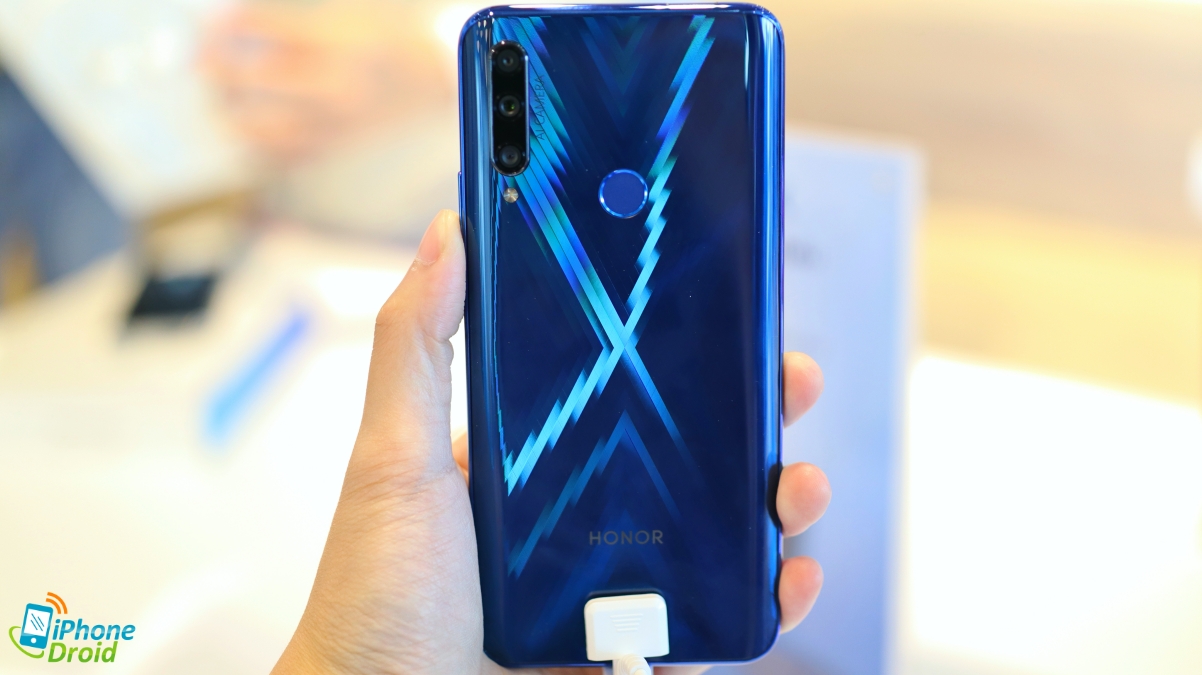 ดีไซน์ของ HONOR 9X เรียกว่าตรงตามตัว “X” ด้านหลังเลยทีเดียวเพราะมีการเล่นเฉดสีเป็นอักษรอย่างชัดเจน ทั้งยังมีการไล่เฉดต่างๆ เมื่อสะท้อนกับแสงแต่ละมุมด้วย โดยการไล่เฉดแบบนี้จะมีแค่ในสีน้ำเงิน Sapphire Blue เท่านั้นครับ ส่วนสีดำ Midnight Black จะมาแบบเรียบๆ แต่คลาสสิก