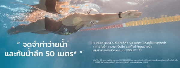 HONOR Band 5 กันนำได้ลึกถึง 50 เมตร และสามารถบันทึกจำนวนแขน (Stroke), ความเร็ว, ระยะทาง รอบเวลา, การเผาผลาญแคลอรี่ และค่าเฉลี่ย SWOLF สำหรับการว่ายน้ำหลากหลายสไตล์ เพื่อช่วยให้ผู้ใช้งานวัดประเมินผลการฝึกซ้อมและพัฒนาเทคนิคการว่ายน้ำได้มากที่สุด