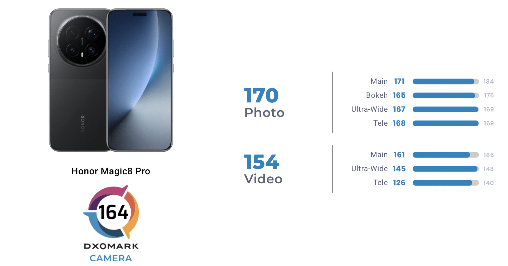 ซึ่งถ้าเทียบเป็นอันดับแล้วคะแนน 164 ของ HONOR Magic8 Pro จะอยู่ที่ 5 ของตาราง เป็นรองแค่ vivo X200 Ultra, iPhone 17 Pro, OPPO Find X8 Ultra และ HUAWEI Pura 80 Ultra เท่านั้นครับ ซึ่งคะแนน 164 จะแบ่งเป็นหมวด ๆ ดังนี้