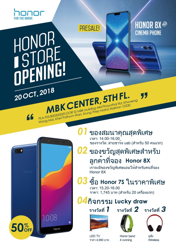 ออเนอร์เปิดตัวร้านค้าสาขาแรกอย่างเป็นทางการในประเทศไทยในวันที่ 20 ตุลาคม ณ ห้างสรรพสินค้า MBK Center ชั้น 5 โดยภายในร้านได้รวบรวมผลิตภัณฑ์ของออเนอร์หลากหลายรุ่น อาทิ HONOR 7X, HONOR 10, HONOR Play และอุปกรณ์อื่นๆอีกมาย มาให้ลูกค้าได้สัมผัสและทดลองใช้งานก่อนการเลือกซื้อ