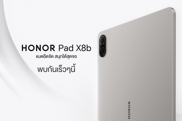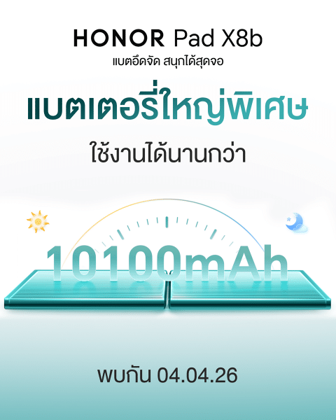 เตรียมสัมผัสประสบการณ์การใช้งานแท็บเล็ตอัจฉริยะรุ่นใหม่ HONOR Pad X8b เปิดราคาอย่างเป็นทางการและเริ่มวางจำหน่ายในวันที่ 4 เมษายน 2569 เป็นต้นไป ที่ HONOR Experience Store ทุกสาขา ร้านค้าตัวแทนจำหน่ายทั่วประเทศ และแพลตฟอร์มออนไลน์ชั้นนำบน Shopee: https://url.in.th/KyyZO หรือ https://url.in.th/wXZaT พร้อมโปรโมชันสุดคุ้มและของแถมพิเศษมากมาย ผู้สนใจสามารถดูรายละเอียดเพิ่มเติมได้ที่เว็บไซต์ www.honor.com/th หรือติดตามข่าวสารและกิจกรรมได้ที่เฟซบุ๊ก HONOR Thailand