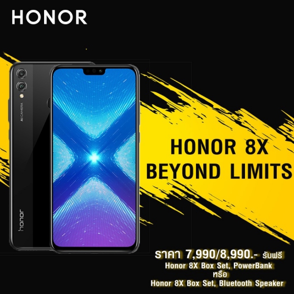 - เมื่อซื้อสมาร์ทโฟน HONOR 8X ในราคาเริ่มต้นที่ 7,990 บาท รับฟรีทันที! HONOR 8X Box Set และ Power Bank ความจุ 7,500 mAh หรือ HONOR 8X Box Set และ ลำโพงบลูทูธ