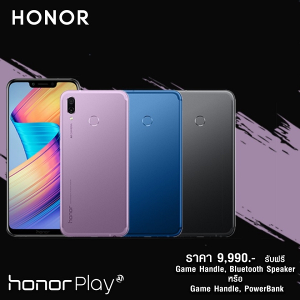 - เมื่อซื้อสมาร์ทโฟน HONOR Play ในราคาเริ่มต้นที่ 9,990 บาท รับฟรีทันที! อุปกรณ์ Game Handle และ ลำโพงบลูทูธ หรือ Power Bank ความจุ 7,500 mAh และ อุปกรณ์ Game Handle