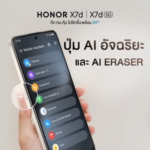 ออเนอร์ (HONOR) เดินหน้าตอกย้ำจุดยืนสมาร์ตโฟน “ถึก ทน คุ้ม ไปอีกขั้น พร้อม AI” เปิดตัว HONOR X7d Series อย่างเป็นทางการในประเทศไทย มาพร้อมสองรุ่นให้เลือก ได้แก่ HONOR X7d 4G (8+256GB) และ HONOR X7d 5G (8+256GB) โดดเด่นด้วยดีไซน์แข็งแกร่งระดับพรีเมียม มาตรฐาน IP65 กันน้ำกันฝุ่น และการรับรองความทนทานระดับ 5 ดาวจาก SGS ที่สามารถทนต่อแรงตกกระแทกจากความสูงถึง 2 เมตร เสริมด้วยฟีเจอร์ AI อัจฉริยะครบชุด ทั้ง AI Button สำหรับเรียกใช้งานคำสั่งสำคัญอย่างรวดเร็ว และ AI Eraser ที่ลบสิ่งรบกวนในภาพได้แนบเนียนราวมือโปร พร้อมแบตเตอรี่คู่ความจุเต็มพิกัด 6,500mAh ใช้งานได้ยาวนานตลอดวัน ครบทั้งความถึกและความฉลาดในเครื่องเดียว เปิดราคาสุดคุ้มเริ่มต้นเพียง 5,999 บาท พร้อมวางจำหน่าย 23 ตุลาคมนี้ทั่วประเทศ