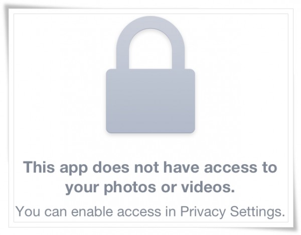 สำหรับการใช้งานบน iOS6 ได้เพิ่มการเข้าถึงอัลบั้มภาพหรือ Privacy ถ้าเราไม่ได้ยอมรับการเข้าถึงในการเข้าใช้งานครั้งแรกก็จะไม่สามารถเข้าไปเลือกภาพในอัลบั้มภาพได้ การเข้าใช้งานครั้งแรกเพื่อไปดึงรูปจากอัลบั้มภาพจะมีคำถามว่า Would Like To Access Your Photos ถ้าตอบ OK เราก็จะสามารถเข้าไปอัลบั้มภาพได้ แต่ถ้าตอบ Don’t Allow ก็จะไม่สามารถเข้าไปใช้ได้ แต่ก็สามารถเข้าเปิดใช้งานภายหลังได้ครับ