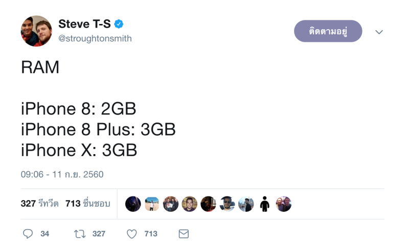 ตามข้อมูลจาก Steve T-S หรือรู้จักกันบนทวิตเตอร์ในชื่อ @stroughtonsmith ได้ออกมาโพสต์ว่า iPhone 8 มีแรม 2GB ในขณะที่ iPhone 8 Plus มีแรม 3GB และ iPhone X ก็มีแรม 3GB เช่นเดียวกัน
