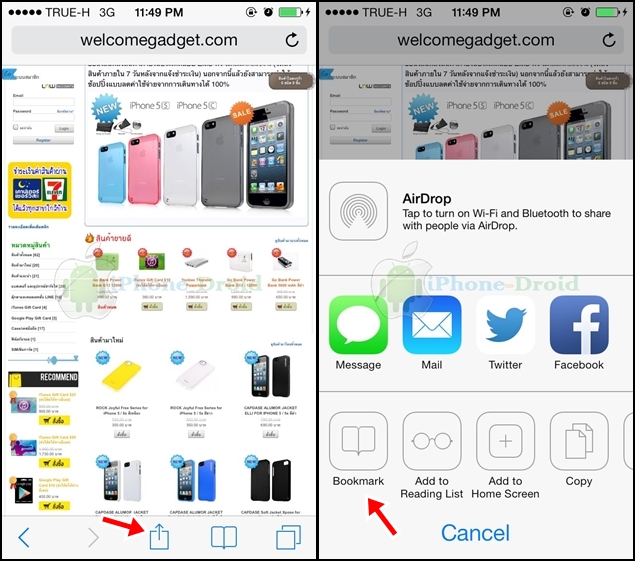 วิธีเพิ่ม bookmark ให้อยู่หน้าแรกของ Safari หลังจากที่เปิดหน้าเว็บแล้ว เลือกไปที่ลูกศรชีขึ้น เลือกไปที่ Bookmark (ที่คั่นหน้า)