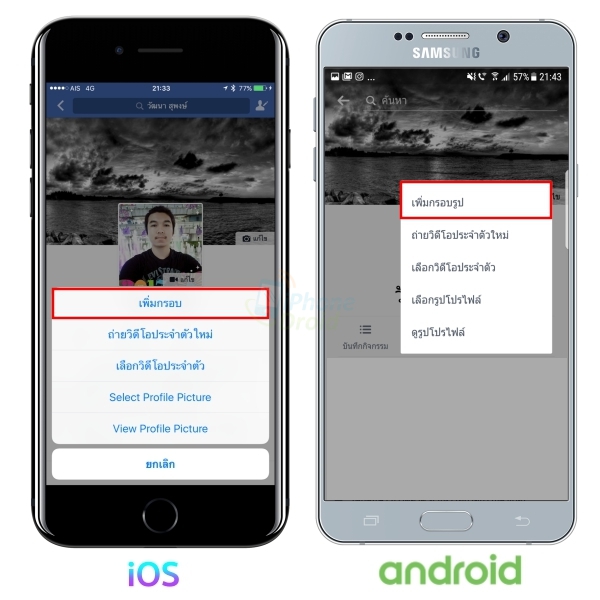 2. เลือกเมนู “เพิ่มกรอบ” (สมาร์ทโฟนบางรุ่นจะไม่รองรับฟังก์ชั่นนี้ คือจะไม่มีเมนูนี้ ต้องไปทำผ่านเว็บแบบเดสก์ท็อป)