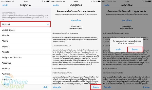 2. ในหน้านี้เลื่อนหาประเทศ Thailand เมื่อเลือกเสร็จแล้วกดปุ่ม ถัดไป จากนั้นจะพบกับหน้ารายละเอียดข้อกำหนดการใช้งาน ให้เลือกยอมรับโดยกดไปที่ ยินยอม (Agree) และกดที่ ยินยอม (Agree) อีกครั้ง