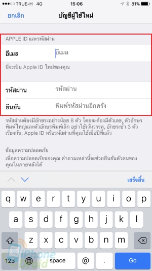 3. ให้กรอก Email และตั้ง Password ลงไปให้ครบถ้วน Email ที่กรอกต้องเป็น Email ที่มีอยู่จริงและยังไม่เคยใช้สมัคร Apple ID มาก่อน และ Password ต้องตั้งยาวอย่างน้อย 8 ตัวอักษรและประกอบด้วยตัวพิมพ์เล็ก พิมพ์ใหญ่ และตัวเลข เช่น Gs3fLk89 หรือ iD007ThA เพื่อความปลอดภัยต่อการคาดเดาของบุคคลอื่น