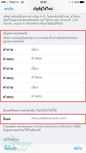 4. เลื่อนลงมาจะเจอคำถามความปลอดภัย ให้เลือกคำถามที่ต้องการแล้วตั้งตอบเองทั้ง 3 ข้อ โดยคำตอบแต่ละข้อต้องไม่ซ้ำกัน สำคัญมากแนะนำให้จดเก็บเอาไว้ และกรอก Email สำรองเพื่อใช้ในกรณีลืมคำถามความปลอดภัย