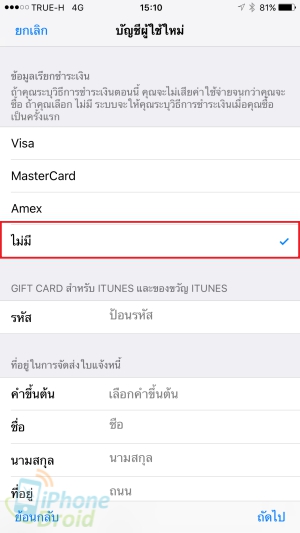 6. ถัดมาจะเป็นหน้ารายละเอียดเกี่ยวกับการชำระเงินและที่อยู่ ให้เลือกที่คำว่า ไม่มี (None) นั่นหมายความว่าเราทำถูกขั้นตอนแล้ว และในช่อง Code ไม่ต้องสนใจ แต่ถ้าไม่มี None ให้ย้อนกลับไปทำข้อ 1 ใหม่อีกครั้ง