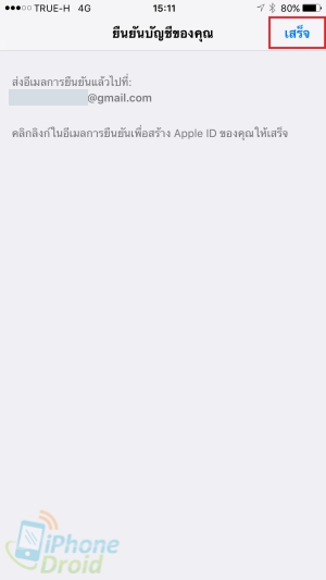 8. หากทำถูกต้องตามขั้นตอน ก็จะพบกับหน้าจอแสดงข้อความการสมัครสำเร็จ ให้กดปุ่ม เสร็จสิ้น (Done) ที่อยู่บริเวณมุมขวาบนของหน้าจอ แล้วไปตรวจสอบ Email ที่ใช้ในการสมัครเพื่อยืนยันการสมัครให้เสร็จสิ้นสมบูรณ์