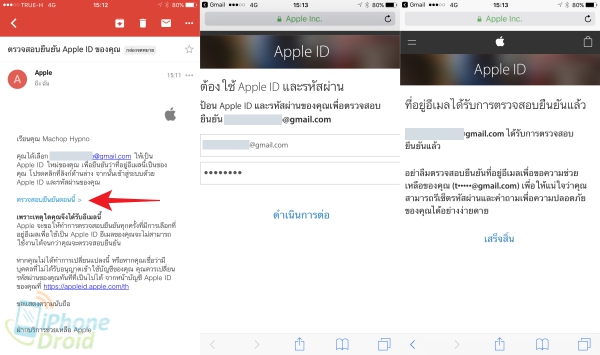 9. หน้าตาของอีเมลที่ส่งมาจาก Apple เพื่อให้เรายืนยันการสมัคร โดยให้กดที่คำว่า ตรวจสอบยืนยันตอนนี้ > (Verify Now) เพื่อไปยังหน้าจอยืนยัน แล้วกรอก Email กับ Password ที่ตั้งเอาไว้ตอนสมัคร จากนั้นกดที่ ดำเนินการต่อ (Continue) และหากทุกอย่างถูกต้องก็จะมีข้อความการยืนยันเรียบร้อยแล้ว เป็นอันเสร็จสิ้นการสมัคร Apple ID