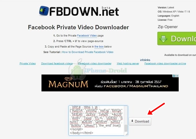 3. หลังจากที่ copy ข้อความทั้งหมดได้แล้วให้เข้าที่เว็บ http://fbdown.net/private-downloader.php เอาโค๊ดที่ copy ไว้ก่อนหน้านี้ไปวางในช่องข้างปุ่มดาวน์โหลดนะครับด้วยการกด Ctrl + V เพื่อวางโค๊ดทั้งหมดนครับ หรือจะคลิกขวาจากเม้าส์แล้วเลือก paste ก็ได้เช่นกันครับ จากนั้นกดปุ่ม Download
