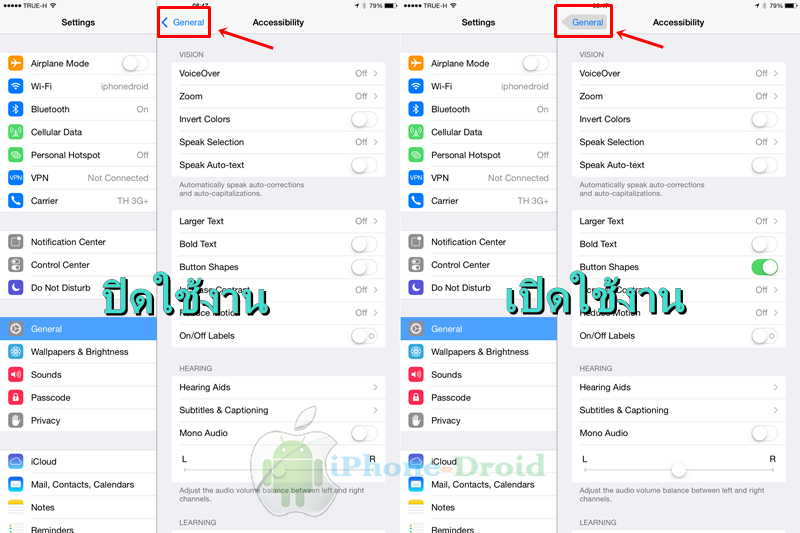 การเปิด-ปิดใช้งาน เข้าไปที่เมนูตั้งค่า (Settings) >> ทั่วไป (General) >> การช่วยการเข้าถึง (Accessibility) >> “รูปร่างปุ่ม หรือ Button Shapes”