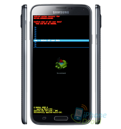 4. กดปุ่มลดเสียง (Volume down) เพื่อเลื่อนลงมาที่เมนู Yes — delete all user data จากนั้นกดปุ่มปิด/เปิดเครื่อง (Power) เพื่อเลือกเมนูนี้