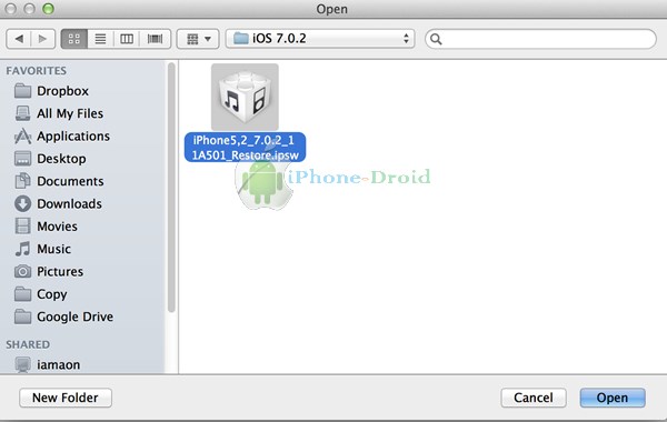 ชื่อไฟล์ ยกตัวอย่างเช่น iPhone 5 จะใช้ชื่อไฟล์ iPhone5,2_7.0.2_11A501_Restore.ipsw นะครับ เลือกไฟล์ iOS 7.0.2 ที่โหลดไว้ก่อนหน้านี้ได้แล้วคลิกที่ Open นะครับ