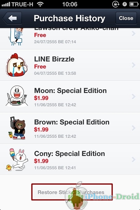 4. ในหน้า Purchase History(ประวัติการซื้อ) ให้เลื่อนลงไปข้างล่างสุด แล้วกด Restore Purchase(กู้ข้อมูลการซื้อสติ๊กเกอร์)