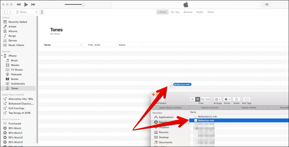 2. ให้ทำการลากไฟล์ริงโทน Reflection.m4r ที่ดาวน์โหลดมาไว้แล้ว ไปใส่โฟลด์เดอร์ Tones ของ iPhone