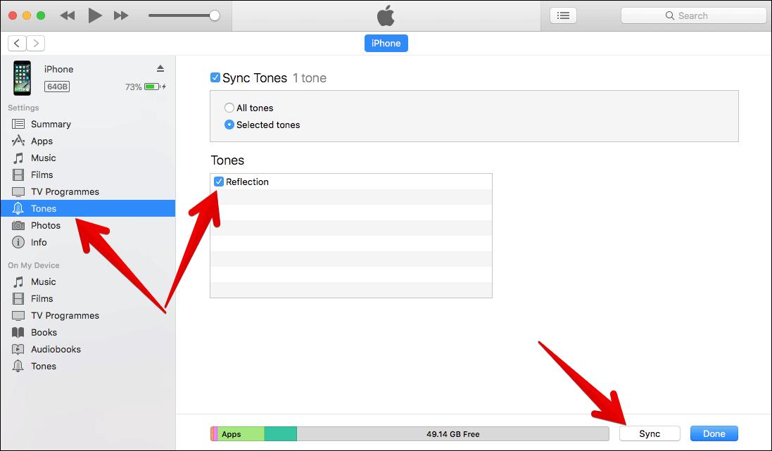 ในกรณีที่ไม่สามารถลากไฟล์ริงโทนไปวางได้ ให้คลิกที่ Tones ที่อยู่ในส่วนของ Settings แล้วเลือก Reflection จากนั้นคลิกที่ Sync เพื่อทำการถ่ายโอนไฟล์ริงโทนไปยังเครื่อง iPhone