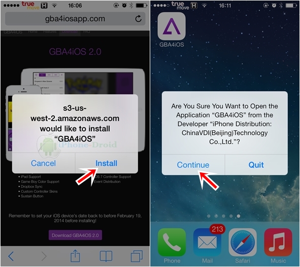 เลือกที่ install หลังจากติดตั้งเรียบร้อยจะได้ไอคอนของแอพ GBA4iOS แบบในภาพนะครับ เปิดขึ้นมาได้เลยเลือกที่ Continue