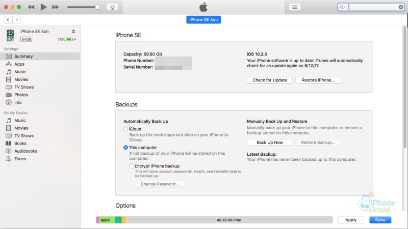 เชื่อมต่อ iTunes เข้ากับคอมพิวเตอร์ > เลือกที่ Backups > This Computer