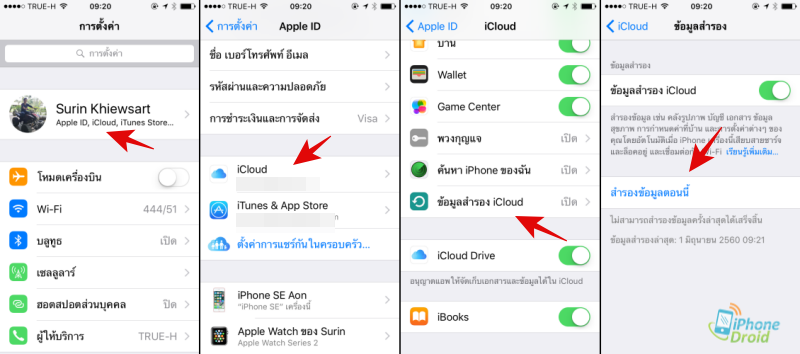 การตั้งค่า > Apple ID > iCloud > ข้อมูลสำรอง iCloud > สำรองข้อมูลตอนนี้ (ต้องใช้ไวไฟในการสำรองข้อมูล)
