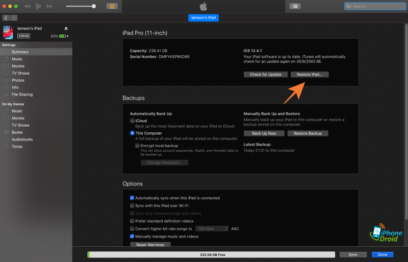 วิธีที่ 1 ติดตั้งผ่านโปรแกรม iTunes ด้วยการ Restore ให้เชื่อมต่ออุปกรณ์ iPad เข้าคอมพิวเตอร์ ด้วยสาย Type-C เปิด โปรแกรม iTunes กด Shift ที่คีย์บอร์ดค้างไว้ (สำหรับ Windows) และ (option สำหรับ Mac) และให้คลิกที่ปุ่ม Restore iPhone
