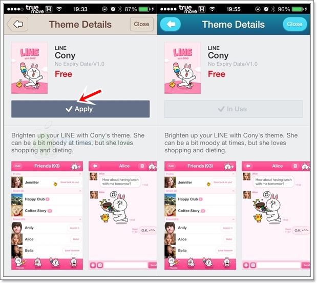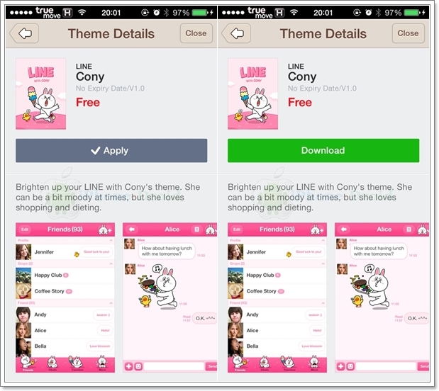 วันนี้ (17-02-14) LINE ออกอัพเดทใหม่เวอร์ชั่น 4.0.0 สำหรับการเปลี่ยนธีมนั้นยังใช้วิธีเดิมแต่ไฟล์ธีมต้องเปลี่ยนใหม่จะใช้ของเวอร์ชั่นที่ต่ำกว่า 4.0.0 ไม่ได้เนื่องจากตำแหน่งต่าง ๆ ได้ปรับเปลี่ยนไป และในวันนี้มีธีมที่สามารถใช้กับเวอร์ชั่น 4.0.0 มาฝากกันครับ และจะอัพเดทให้เรื่อย ๆ