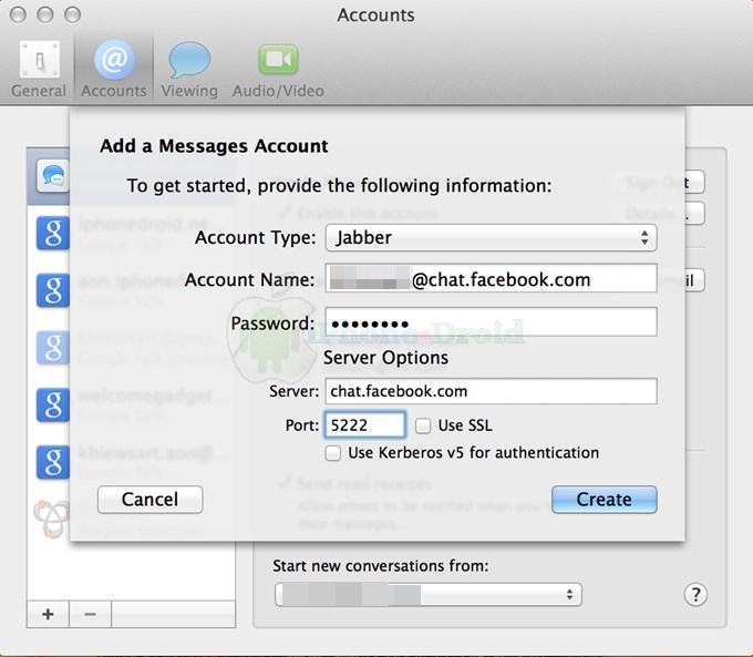 STEP 4: จากนั้นให้พิมพ์ username ของ Facebook ของเราลงไป ที่อช่อง Account Name ครับแล้วตามด้วย @chat.facebook.com ยกตัวอย่างเช่น https://www.facebook.com/iPhoneDroid.net username ของเราก็คือ iphonedroid.net เราก็จะต้องพิมพ์ลงไปว่า iphonedroid.net@chat.facebook.com