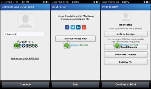 จากนั้น BBM จะสร้าง PIN ให้ครับพร้อมกับให้เราตั้งชื่อที่แสดงผลและใส่รูปภาพ เลือก Continue ขั้นตอนต่อเราเราจะแชร์ไปให้เพื่อน ๆ เรารู้เลยหรือไม่ก็ได้นะครับ หรือจะเลือก Skip เพื่อไปขั้นตอนต่อไป จากนั้นเลือก Continue BBM เพื่อเริ่มใช้งานกันได้เลย
