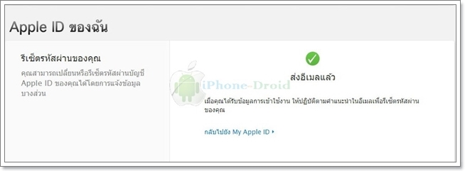 หลังจากที่เลือกถัดไปเรียบร้อยแล้วระบบจะทำการส่งเมล์สำหรับรีเซ็ตรหัสผ่านไปให้ที่เมล์ที่เป็น Apple ID / iCloud ที่กรอกไปก่อนหน้านี้ครับ
