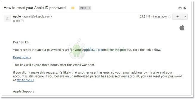 เรามาเช็คเมล์กัน จะเห็นว่ามีเมล์จาก Apple ส่งเข้ามาที่เมล์ที่เป็น Apple ID ของเราแล้วเลือกที่ Reset now (ลิงค์จะหมดอายุภายใน 3 ชม. ให้รีเซ็ตทันทีหลังจากที่ได้รับเมล์แล้ว)
