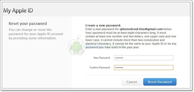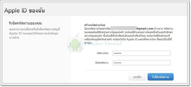 จากนั้นให้ใส่รหัสผ่านใหม่ลงไปได้เลยครับ รหัสผ่านต้องมีอักขระอย่างน้อยแปดตัวขึ้นไปจะต้องมีตัวเลขอย่างน้อยหนึ่งตัวและตัวอักษรอย่างน้อยสองตัว ซึ่งต้องมีทั้งตัวพิมพ์เล็กและพิมพ์ใหญ่ จะต้องไม่มีตัวอักขระที่เหมือนกันอยู่ติดกันสามตัว จะต้องไม่ใช่ Apple ID และรหัสผ่านใด ๆ ที่เคยใช้ในปีที่ผ่านมา และเลือกที่รีเซ็ตรหัสผ่าน ตั้งรหัสผ่านเหมือนกันทั้ง 2 ช่องแล้วคลิกที่ รีเซ็ตรหัสผ่าน