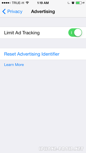 ในส่วนนี้เป็นการติดตามพฤติกรรมผู้ใช้เพื่อนำมาใช้กับการโฆษณาให้ตรงกลุ่มเป้าหมาย ซึ่งไม่จำเป็นต่อผู้ใช้งานอย่างเรา ดังนั้นเข้าไปเปิดได้ที่ Settings >> Privacy >> Advertising >> Limit Ad Tracking แล้วกดเปิด (กดเปิดเป็นการปิดครับ)