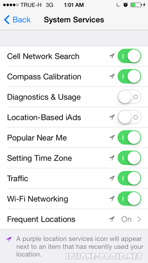 ในส่วนของ Location Services >> เลื่อนลงมาที่ System Services แนะนำให้ปิดการใช้งาน Diagnostics & Usage และ Location-Based iAds ตรงนี้ช่วยเรื่องประหยัดแบตฯได้เยอะเหมือนกัน
