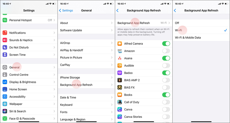 2. ปรับการดึงข้อมูลแอพจากเบื้องหลัง : โดยจะเป็นการไม่ให้แอปต่างๆ รีเฟรชเองเมื่อใช้งานเครือข่าย โดยสามารถเข้าไปตั้งค่าได้ที่ ทั่วไป > ดึงข้อมูลแอพจากเบื้องหลัง > ดึงข้อมูลแอพจากเบื้องหลัง แล้วเลือก Wi-Fi