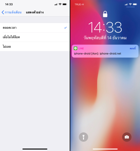 แต่ถ้าหากใครอยากให้การแจ้งเตือนเห็นข้อความได้ทันที โดยที่ไม่อยากปลดล็อคก่อน ให้เข้าไปที่ การตั้งค่า > การแจ้งเตือน > แสดงตัวอย่าง > ตลอดเวลา ถ้าเป็นการตั้งค่าไว้แบบนี้ ไม่ต้องปลดล็อคด้วย face id ก็จะสามารถอ่านข้อความได้ทันที เผื่อว่ามีใครอยากจะใช้ที่ชาร์จไร้สายแบบแนวนอน แล้วอยากจะสะดวกต่อการอ่านโดยที่ไม่ต้องปลดด้วย face id ก่อน ก็สามารถตั้งค่าแบบนี้ได้