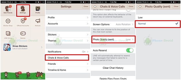 เมนูภาษาอังกฤษ : More > Settings > Chat & Voice Calls > Photo Quality > ให้ปรับจาก Low เป็น Normal