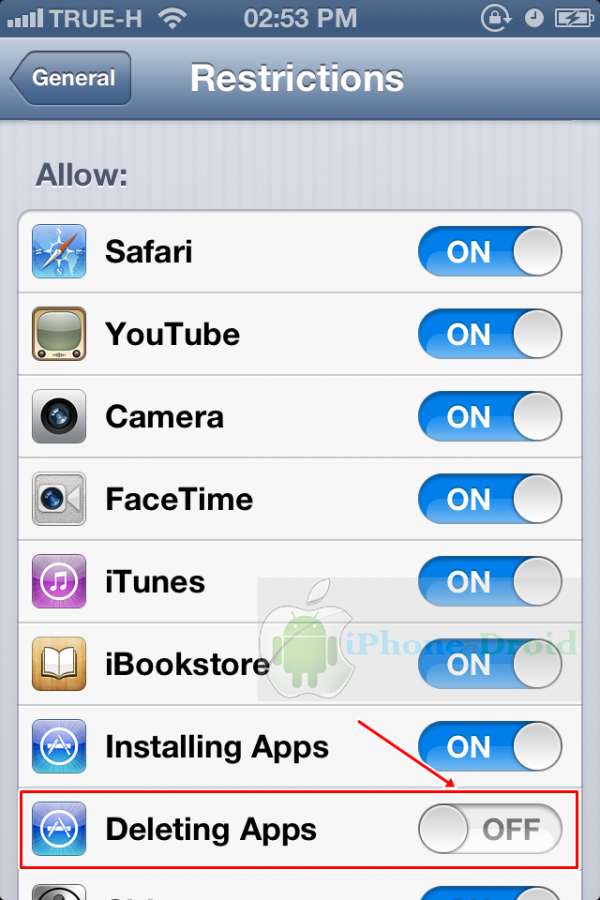 2. หลังจากที่ตั้งค่า Password 2 ครั้งเรียบร้อยแล้วให้ไปที่ Deleting Apps และให้เลือก OFF